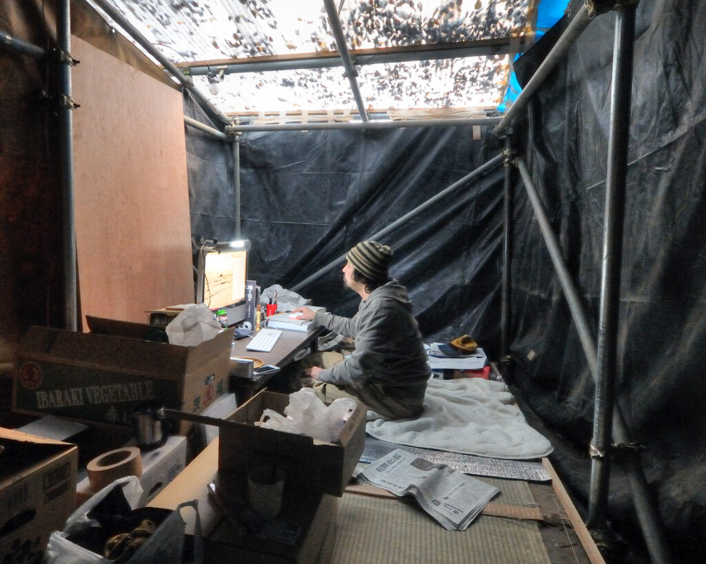 建築家の渡辺豊和さんが以前に『芸能としての建築』というのを書いていますが、今回の芝居のイメージも、そこからきている部分があります。それは、戦国時代にお城をつくる特殊な技術集団がいて、そういう人達は、役目を果たすと権力者から殺されるという話です。そこから逃れて、どんどん北へと逃れ、山間にへばりついて住み、今でも北の方へいくと、なんでこんな山間にこんなものがあるのかと驚くような建築物が存在しているんですよね。そのなかで渡辺豊和さんは、漂流していく建築の職能集団を考える必要があるんじゃないかというようなことを書いているんです。僕が仕事でずっと扱ってきたのは不動産といわれるもので、建てたら移動できないでしょう?でも、それをつくっている人は、反対に移動するんですよね。高度経済成長の頃や、バブル経済の時は、建築の仕事がたくさんあって、労働者たちはどこが給料がいいか聞きつけては地方を転々としていた。山谷の玉三郎っていう、うちの幕間の人気者がいるんだけど、山谷だけじゃなく、大阪の釜ヶ崎だって玉ちゃんの名前は知られてるんだよね。そんなふうに労働者は場所をしばられず自由に行き来してた。身軽だけど、なんの保証もないんです。僕らだって、どんなに所長から「お願いします、明日も来てください」と言われて現場に行っていても、出来た途端にもうお払い箱、次の日から不法侵入者ですからね。岡林信康の山谷ブルース「工事終わればそれっきり お払い箱の俺たちさ」、まさにその通りですよ。