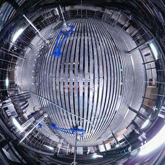 スノコは、オペラ劇場ということで、通常、多目的ホールなどで見られる音響反射板がなく、そのための機器がないので非常にすっきりとしています。音響反射板は吊りだけでなく、収納のために平面的な移動を伴うので、他の吊りものと干渉して計画が難しい部分なのですが、これがないことでスノコを使う上での自由度が高くなっています。青色の業務用掃除機のように見えるものは、移動型の吊り機器で、必要に応じた場所に設置することができます。見通しがよくすっきりしていることは安全性にもつながるでしょうし、まだ未熟な学生が関わることを考えると、良い点だと思われます。反面、音楽大学なのにオーケストラのための音響反射板を設置しないことは、かなり反対意見もあると思いますが、オペラ劇場に最適化するという大きな決断をすることで、一見わかりにくいかもしれないけれども、様々な部分でその長所を生んでいる思われます。