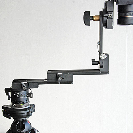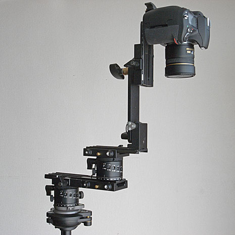 冒頭の写真は、最近使用しているセッティングです。水平プレートと垂直部の取付け方向を逆にしてスライディングプレートアダプタを介して両方向にセットできるようにしています。レベラーに取付けている最初の水平プレートが写真ではロングプレート(アダプタをつけて断面積を大きく安定性を増し、かつセッティング用のガイドにしている)を付けていますが、これはショートタイプに変えてもいけるので、ちょっと思案中。持ち出し距離を稼げるメリットと安定性(ミラーショックによるブレ)と比べてどうしようかと。あと底面撮影時に2台目の300N(回転台)を回転させますが、戻したときにクリックストップとはいえ目盛りの確認をしないとわずかですがズレる可能性があります。使用パーツが増えるほど取付け誤差が生じる可能性も増すので、ちょっと迷うところなのですが、このセットが便利なのは、いったんカメラを据え付けたら底面撮影でもカメラをはずす必要がないということです。