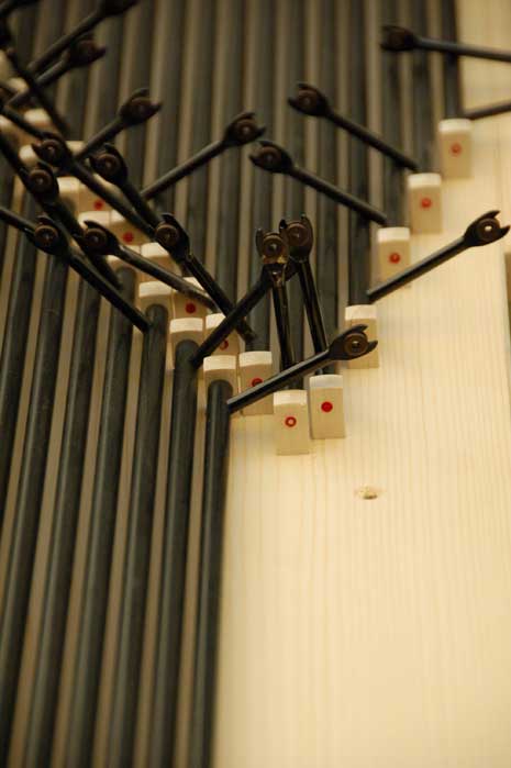 ついこの間、検査をして引き渡しが済んだばかりなのにオルガン工事が始まった途端に工事現場に逆戻りしてしまいました。オルガンについては施主とオルガンビルダーの契約なので我々建築の設計者も施工者も関係がないのですが、何かと心配なのでこうして様子を見にきています。あらかじめ作られたパーツを組み立てるだけだと聞いていたのですが、ほとんどバラバラの状態から組み立てるような感じです。パーツを見てもそれがどうなるのかは全くわかりません。職人さんに話でも聞ければいいのですが、なにせ相手はスイスから来ているのでドイツ語じゃないと通じないし。