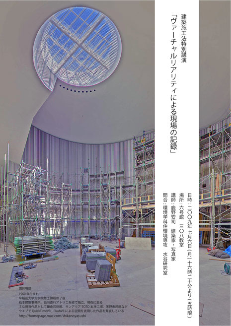 去年はひとつの建物の着工から竣工までをQTVRで説明したのたけど、なんだかちょっと散漫な印象があったので、今年は前半部分で「なんでこんなことをしているのか」とか「どうやっているのか」などを話して後半では実例を挙げて説明することにしました。