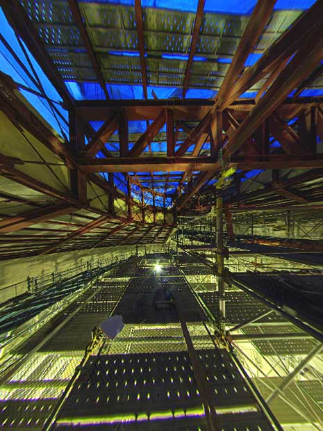 上の写真は礼拝堂の天井を工事するための足場から撮影した映像です。上部中央の青い部分は直径8メートルのトップライトになる部分で、この部分はもうすぐ鉄骨の上にトップライトが取付けられる予定。